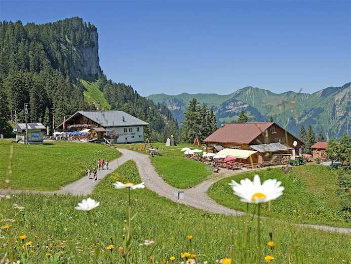 Einkehrmöglichkeiten im Alphof Rossstelle, im Restaurant Simma sowie in den Gastronomiebetrieben in Mellau vorhanden.