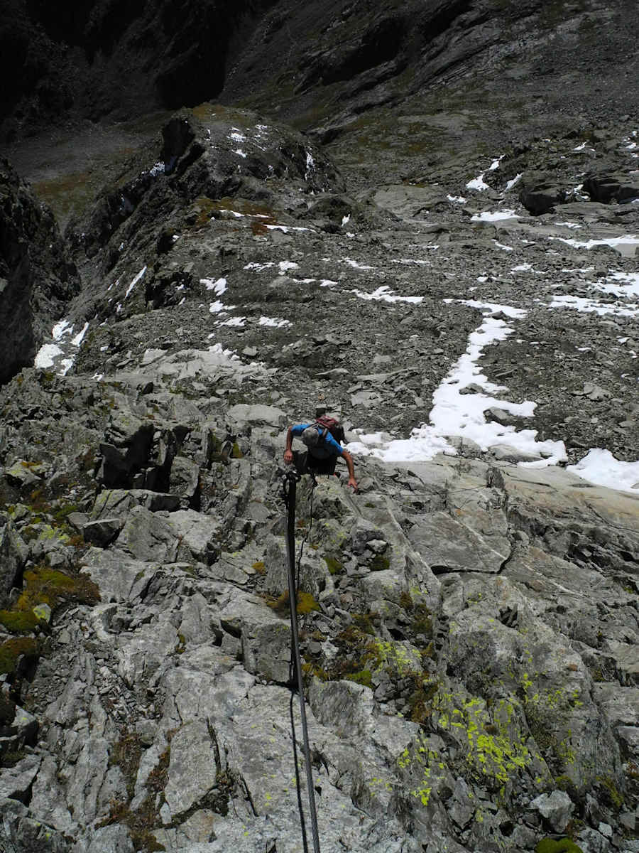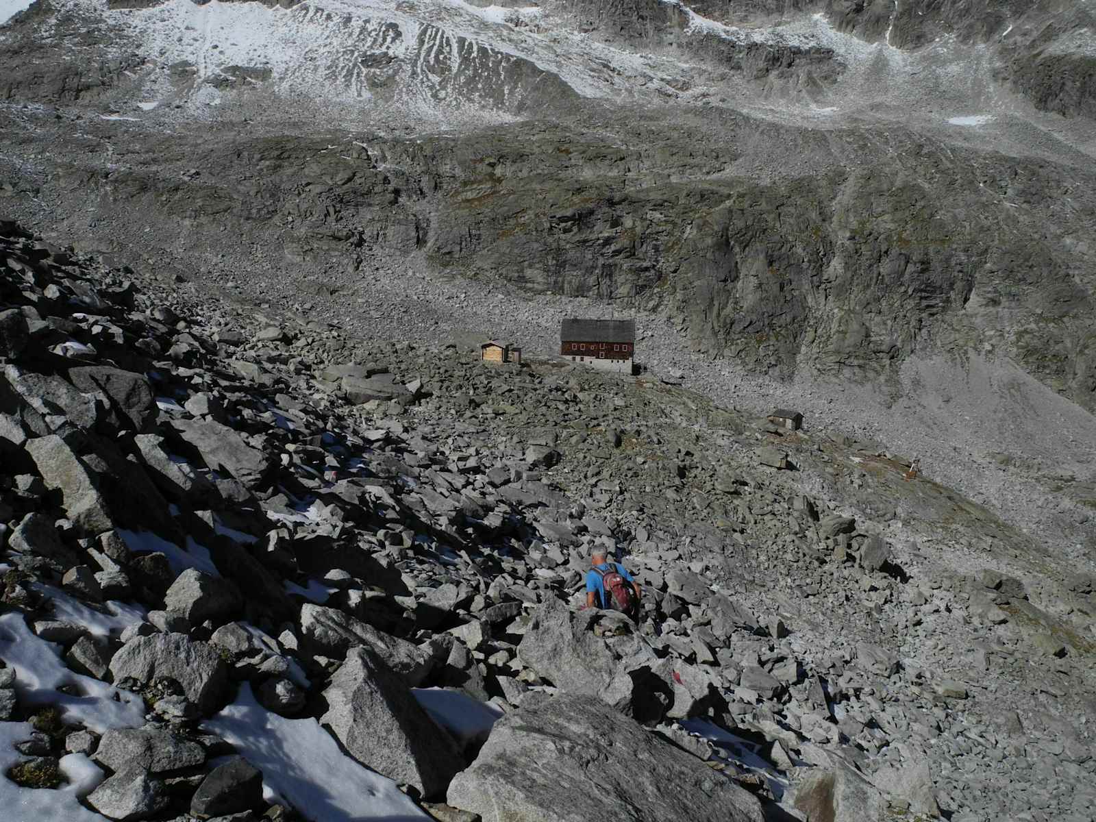 Ab da wird es dann extrem schwierig, den Weg zu finden. Die rot-weissen Markierungen sind teilweise schon so abgewittert, dass man sie kaum mehr erkennen kann. Schnee, Eis und loses Gestein erschweren zusätzlich den Abstieg. Bei Nebel oder schlechter Sicht ist man dort oben gefangen. Man erreicht schließlich die Seebachalm.