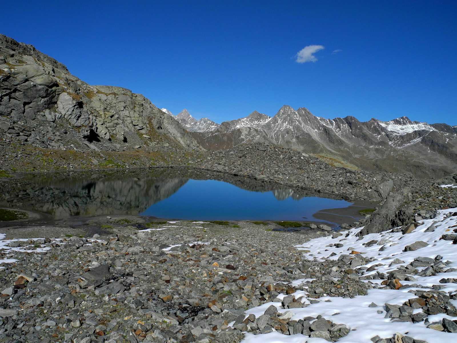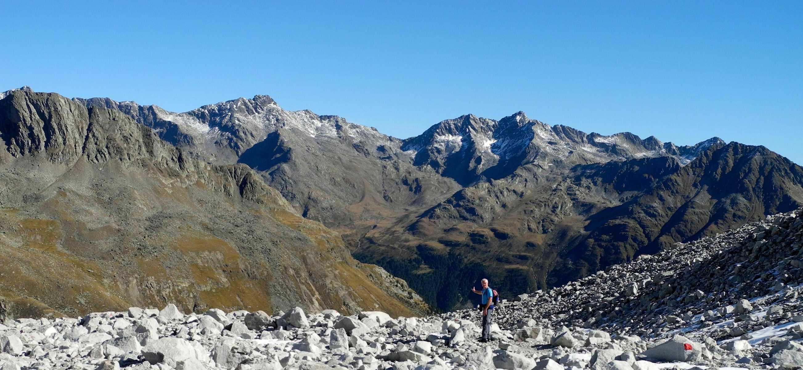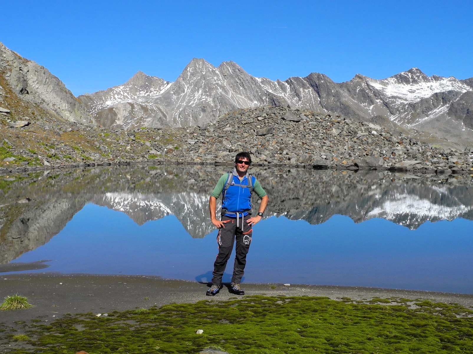 Im Süden die Dolomiten und die Villgrater Berge, im Osten die Julischen Alpen, im Norden die Eisriesen der Venedigergruppe und im Westen kann man schon die ersten Berge der Zillertaler Alpen erblicken. Der Abstieg von der Rosshornscharte zur Seebachalm hat es dann wirklich in sich. Am Beginn geht es noch moderat über das Fleischbachkees, vorbei an einem einzigartigen Gletschersee.