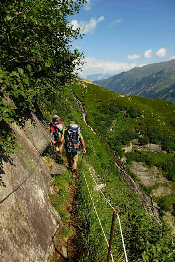 Nach wenigen Höhenmetern bergab erreicht man eine seilversicherte Stelle, wo man die Schlucht der Elsenklamm durchquert. Der Weg schlängelt sich nun den Talkessel entlang bis zur Kasseler Hütte.