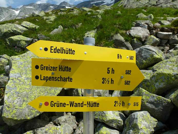 Die sechste Tagesetappe folgt ebenfalls dem Weg Nr. 502 von der Greizer Hütte hinauf zur Lapenscharte. Nach einem längeren Abstieg hält man sich bei der Gabelung rechts und wandert weiterhin auf dem Weg 502 zur Kasseler Hütte.