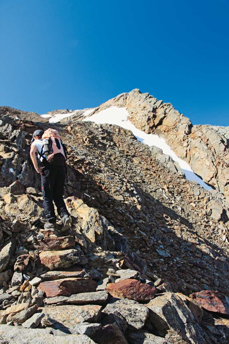 Jenseits ebenfalls weithin über Blockgelände gen Norden hinab. Nach einigen Kehren und einer Drahtseilpassage quert man an einem Geländeriegel über dem Gaiskar entlang und verliert bis in den Bachtrog noch ein paar Höhenmeter. Am Gegenhang wieder steil aufwärts und in den normalen Hüttenweg einmündend zur toll gelegenen Hildesheimer Hütte.