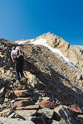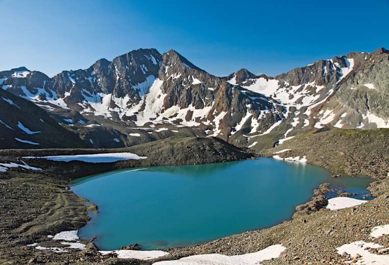 Von der Siegerlandhütte starten wir mit einer sachten Abwärtsquerung ins Triebenkar. Dort geht es über weitläufig flache Moränenfluren sowie den Gletscherabfluss hinweg in die Nähe des türkisfarbenen Triebenkarsees – wieder so ein Kleinod, das die karge Hochgebirgslandschaft belebt. Die Route steilt nun auf, wobei wir uns nach einigen Kehren am äußersten Rand eines Hochkars, nahe an der Steilflanke des Gaiskogels, bewegen. Über etwaige Schneefelder erreicht man die breite Einsattelung am sogenannten Gamsplatzl, 3.018 m.