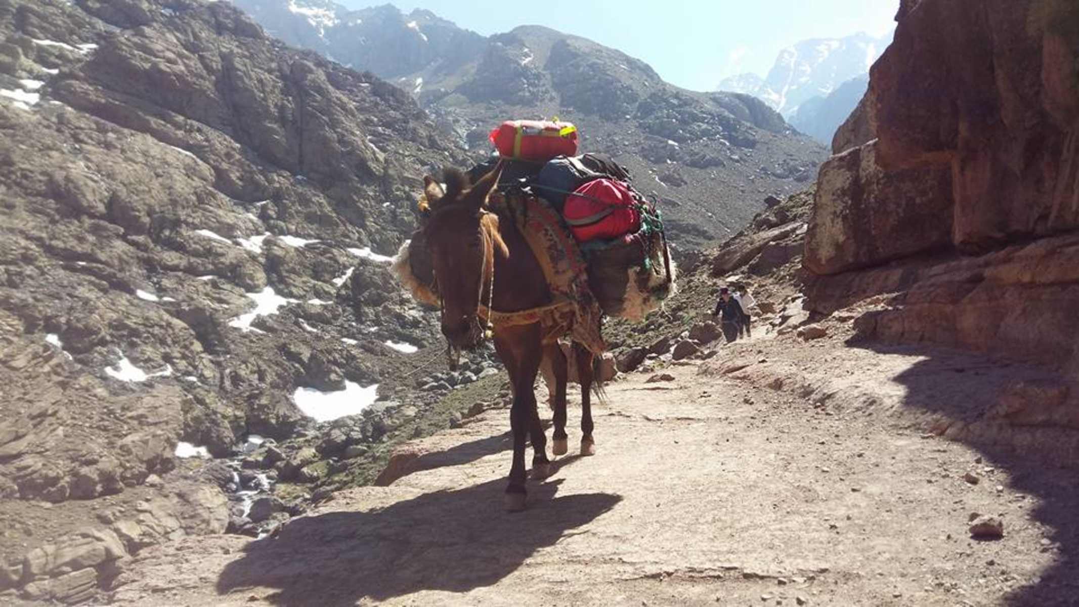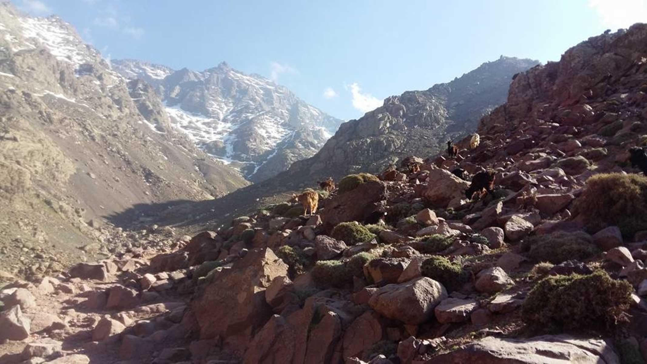Hier überquert man den Bach und folgt dem Pfad weiter bergwärts. Der Aufstieg wird hier nun steiler und anstrengender, bis man in weiteren drei Stunden die Toubkal-Hütte und die Mouflons-Hütte erreicht. In den Hütten schlägt man das Nachtlager auf und beginnt den Gipfelaufstieg wegen der Hitze am besten vor Sonnenaufgang.