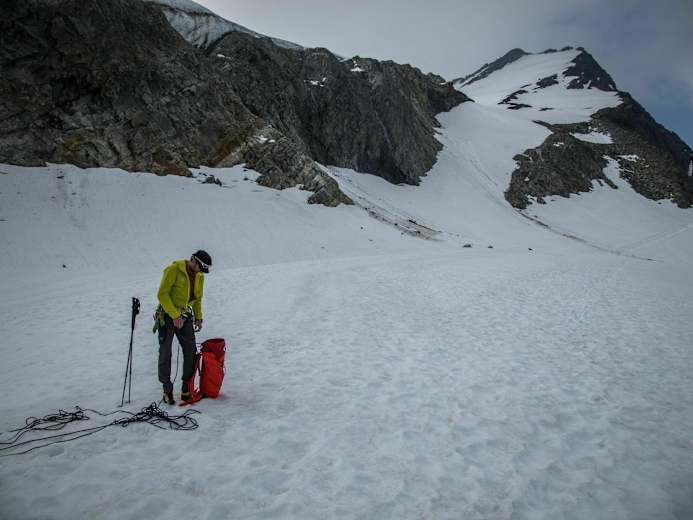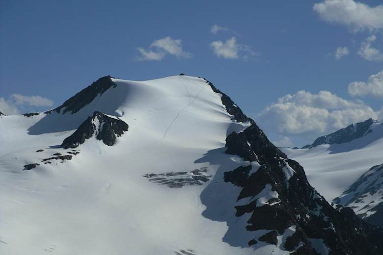 Etwas über der 3000-er Marke quert man ganz nach rechts und steigt am Gletscherrand in Richtung Gipfel. Je nach Bedingungen ist der Bergschrund kurz unter dem Gipfel an passender Stelle zu queren. Die letzten Meter zum Gipfel legt man in leichter Kletterei über die Felsen zurück.