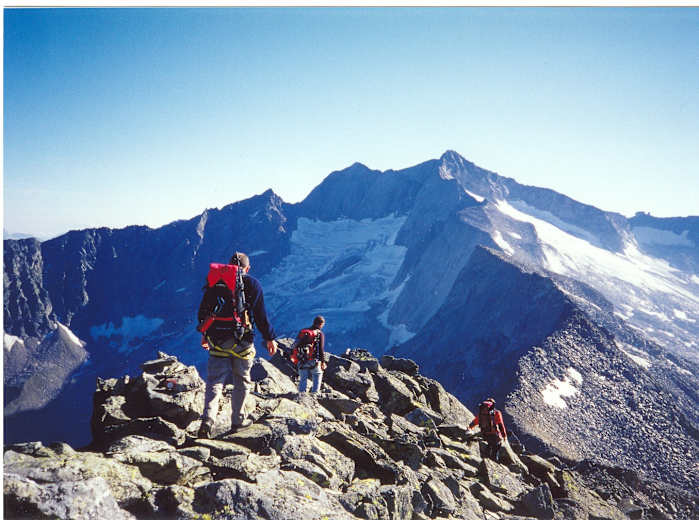 Hier steigen wir rechts über den Weg Nr. 535 über Blockgelände, unterhalb der Winkelspitze vorbei. Danach am Gletscherrand (ev. Steigeisen!) des Trippkees zum Einstieg des Detmolder Grates. Hier beginnt der Klettersteig, der uns teilweise ausgesetzt zum Gipfel führt.
