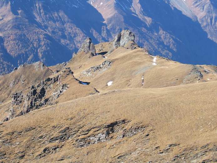 Weiter entlang des Weges Nr. 532 , der links unter dem Gipfelgrat entlang leitet und uns zwischen die kristalldurchwachsenen Gipfelaufbauten der beiden Törlköpfe führt.