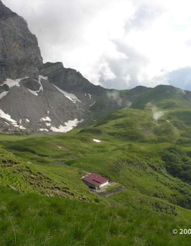 Man überquert einen Steg und geht geradeaus Richtung P. 2204. Über die Seitenmoräne des Gletschers erreicht man ein Geröllplateau und wenig später einen See. Über das links Ufer gelangt man in felsiges Gelände. Die folgende Felsstufe ist mit Seilen gesichert.