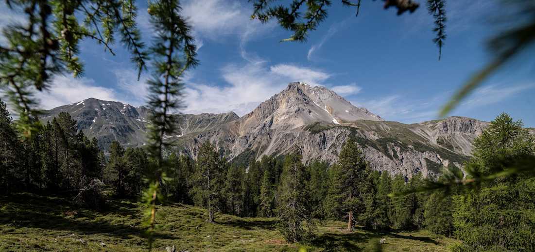 Man folgt dem Weg weiter bis zur Hütte Era da la Bescha. Auf dem Weg dorthin, werden die Bäume immer lichter und bieten einen wunderbaren Ausblick auf die andere Talseite. Nun gelangt man zum Lai da Chazforà (2.596 m).