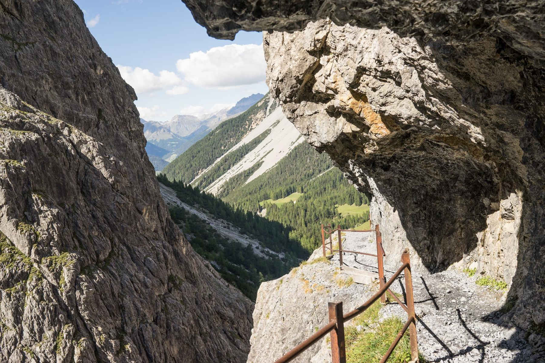Der Weg durch die Felswände von Uina. Foto: Dominik Täuber, Tourismus Engadin Scuol Samnaun Val Müstair AG