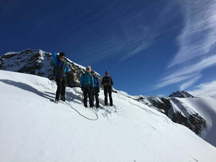 Das Begehen der Tour erfolgt ausschliesslich auf eigenes Risiko. Örtliche Gegebenheiten sind unbedingt zu beachten. Die Route kann sich je nach Verhältnissen und Bedingungen verändern. Die Mammut Mountain School bietet die Tour auf Anfrage geführt an. Mit der Mammut Mountain School können Sie sogar die beiden eindrücklichen 4.000 er-Gipfel Allalinhorn und Weissmies an einem Wochenende besteigen.