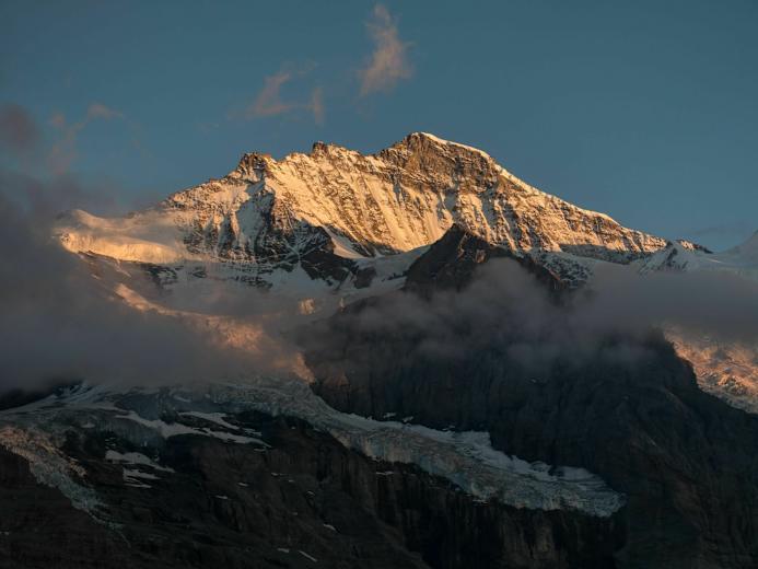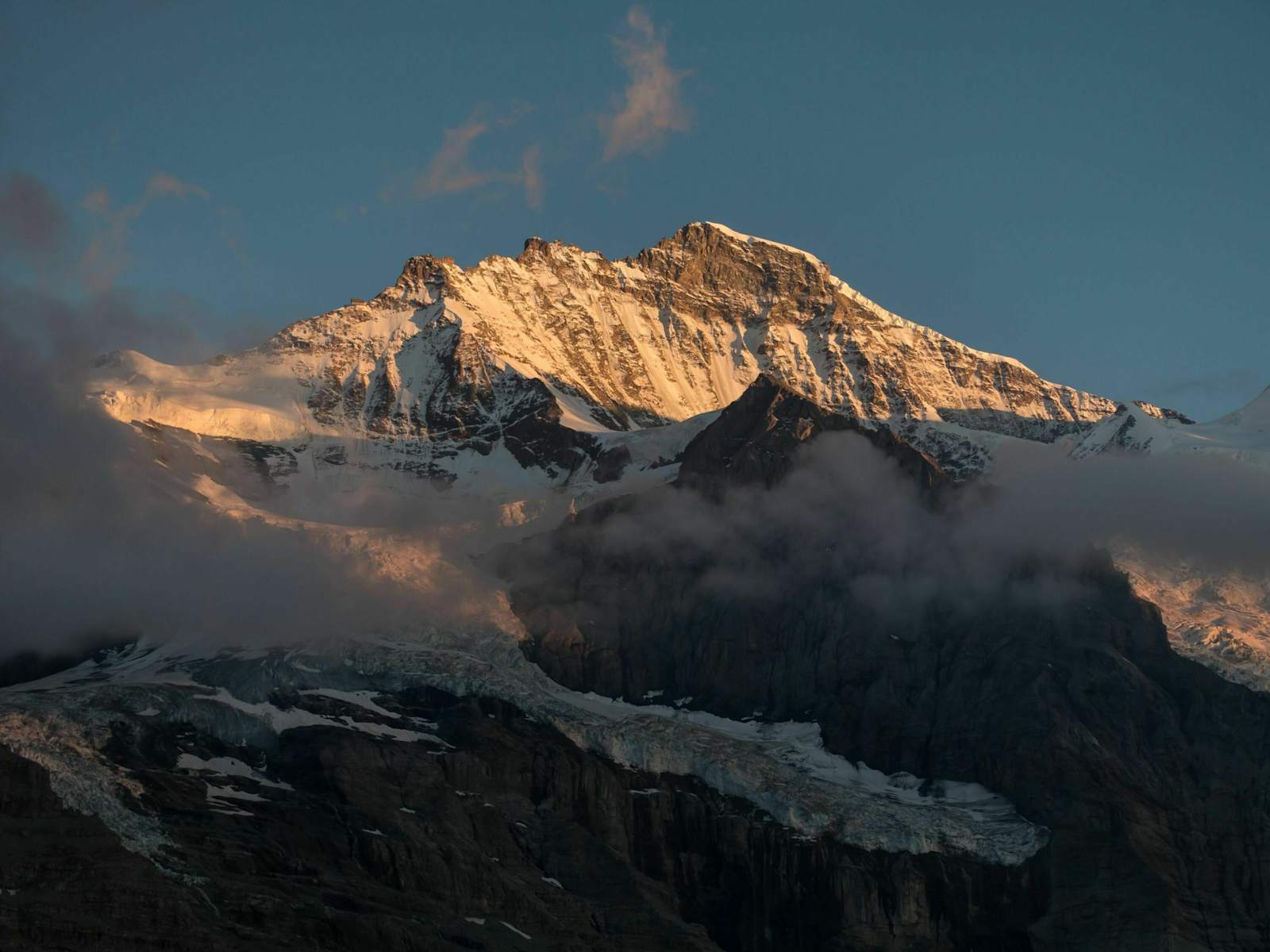 Die Jungfrau (4.158 m) ist der dritthöchste Berg der Berner Alpen und bildet zusammen mit Eiger und Mönch das weltberühmte Dreigestirn an der Grenze zwischen dem Berner Oberland und dem Wallis.