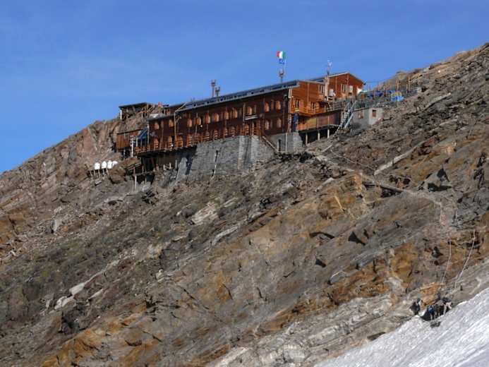 Hier kann man bereits gut die Gnifettihütte sehen. Man folgt der klar erkennbaren Spur und biegt bald darauf links ab. Nun folgt man einem mit Stahlseilen und Tritthilfen gesicherten Weg und erreicht über einige Stufen die Terrasse der Gnifetti Hütte.