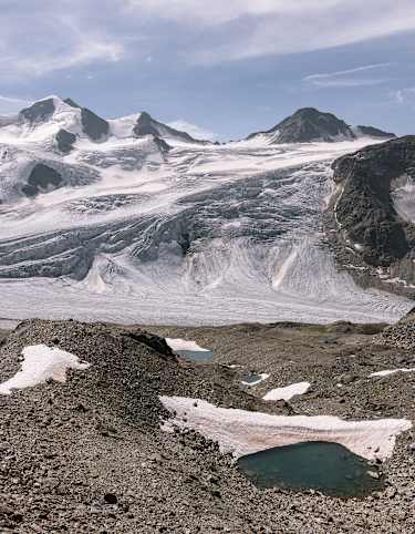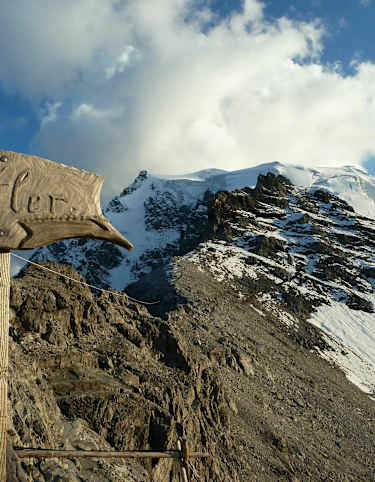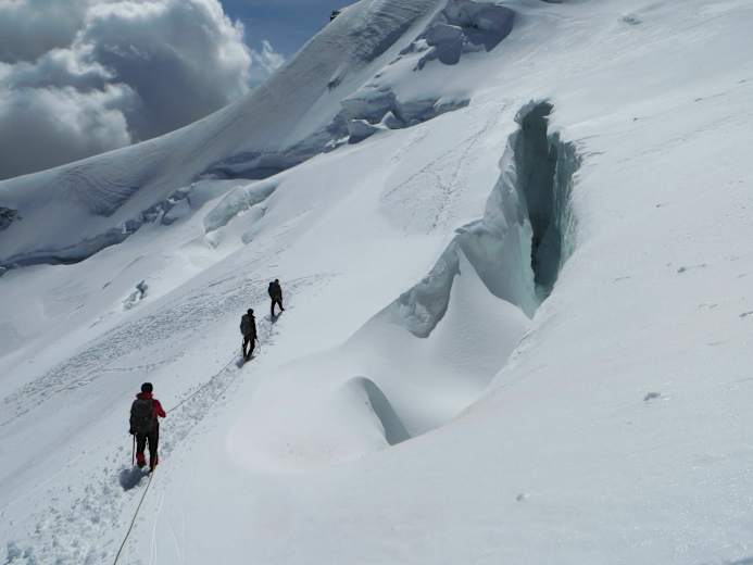 Von hier aus geht es steil hinab zum oberen Teil des Morteratschgletschers, wo man durch ein Spaltenlabyrinth zum flachen Sattel der Fuorcla Crast' Agüzza und weiter zur Marco e Rosa Hütte gelangen. Direkt hinter der Hütte geht es den Firnhang hinauf und nach circa 250 Hm Aufstieg erreicht man den Felsgrat.