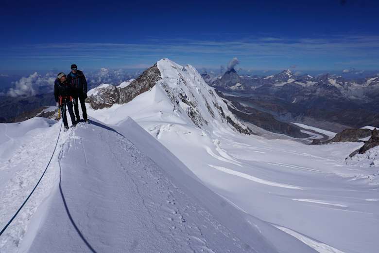 Mit dem Ziel vor Augen geht es über die teilweise luftige Firnschneide zum Gipfel auf 4.443 m.