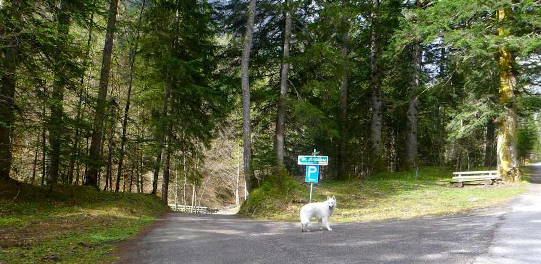 Bei der Kreuzung Walderstraße gerade aus auf die Halltalstraße auffahren und nach ca. 700 m erreicht man den großen Karwendelparkplatz Halltal.