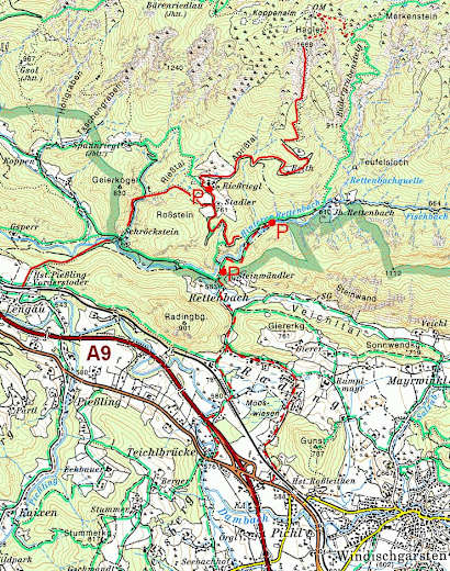 A9 Pyhrnautobahn Abfahrt Rossleiten-Windischgarsten. Kurz Richtung Windischgarsten und sofort nach links abzweigen nach Rading. Auf der schmalen Asphaltstraße durch Rading und weiter nach Rettenbach (kein Ortsschild). Oder von der Teichlbrücke direkt nach Rettenbach (kein Hinweisschild). In Rettenbach rechts Richtung Budergrabensteig/Hoher Nock auf der Schotterstraße ins Hintere Rettenbachtal bis zur ersten Abzweigung. Hier parken (590 m).