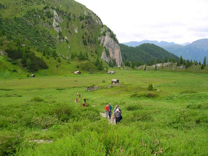 Bei der Prinz-Heinrich-Kapelle auf 1.962 m erreicht man den Obstanserboden und wandert gemütlich über die fast ebene Hochfläche. Früher wurde diese regelmäßig gemäht, wie die Heustadeln noch heute beweisen.