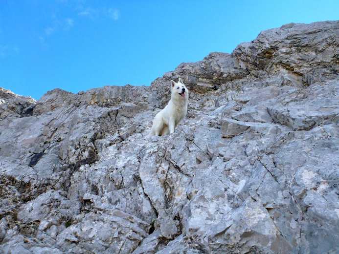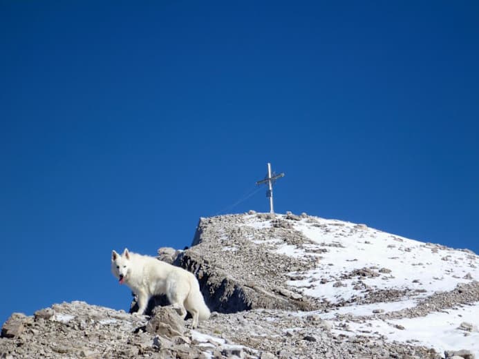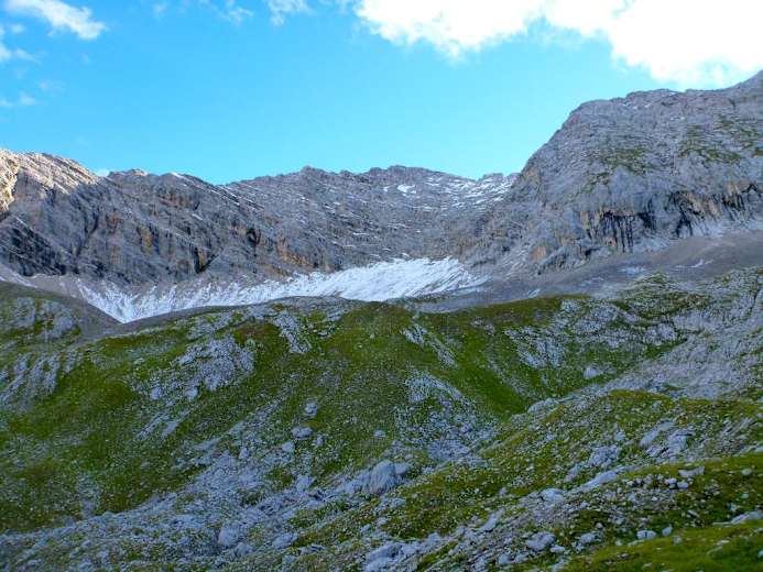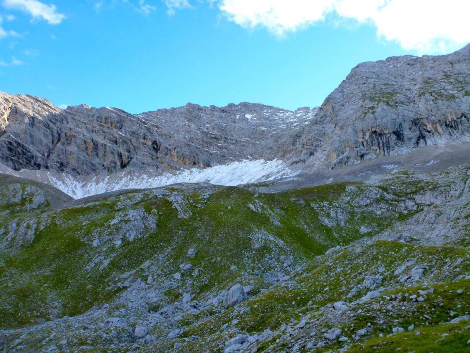 Weiter über kupiertes Wiesengelände, vorbei an grasenden Gamsfamilien, bis ans Ende des Sonntagskares. Hier steilt der Bergpfad auf und es geht über Schotterreisen bis zu den Felsbändern unterhalb des Gipfels. Spätestens ab hier heißt es die Augen offen halten, um die roten Markierungen, die durch die Felsbänder leiten, nicht zu übersehen. Es folgen Kletterstellen I-II, die mit Stahlstiften entschärft wurden, bis man auf das Joch zwischen Roßkopf und Hintere Bachofenspitze gelangt. Jetzt ist es nicht mehr weit und es trennt nur noch der breite Gipfelrücken der Bachofenspitze vom Tagesziel.