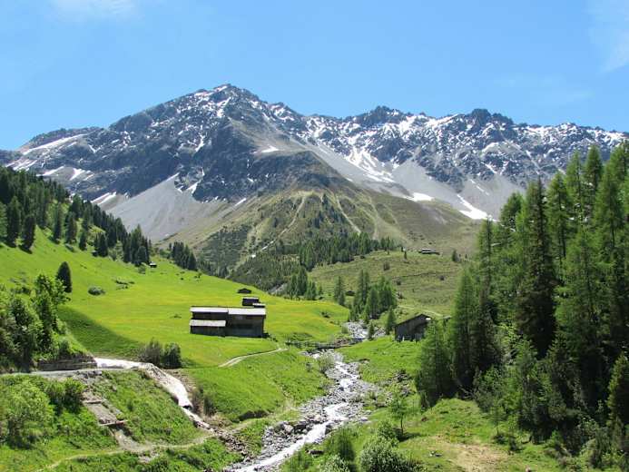 Vom Parkplatz weg schlendert man durch das malerische Dorf Monstein. Am besten, man hat einen zügigen Schritt, ansonsten will man sich gleich in eines der gemütlichen Stuben oder angenehmen Terrassen unter einen Sonnenschirm setzen. Aus dem Dorf heraus folgt man der Beschilderung nach Inneralp. Dieser erste Weg führt durch wunderschöne Lärchenwälder und einige Kuhweiden.