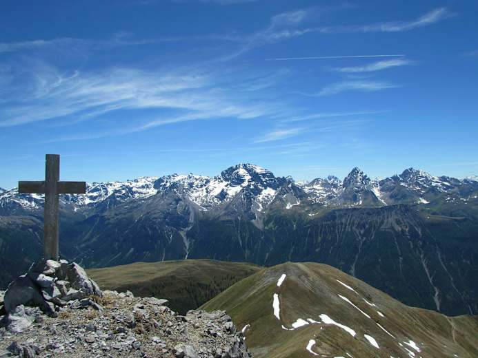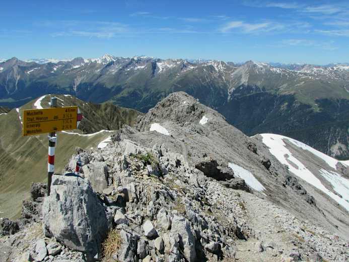 Von der Einsattelung ist der Weg zum Gipfel eine Sache von Minuten. Von hier oben geniesst man einen fantastischen Rundumblick - mit dem Piz Kesch als prominentesten Gipfel der näheren Umgebung.
