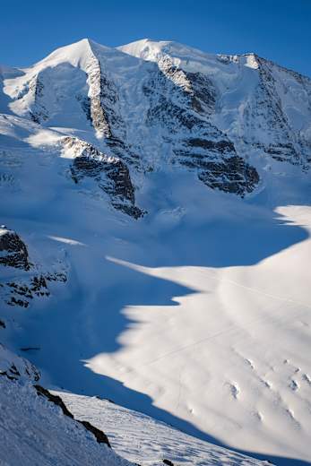 An einem schönen Wintertag auf der Diavolezza versteht man, warum die Berninagruppe als „Festsaal der Alpen“ tituliert wird. Selten sind schönere Berggestalten hintereinander aufgereiht wie hier. Mit seinen drei Gipfeln und den nordseitig eingelagerten Hängegletschern stellt der Piz Palü die imposanteste Erscheinung dar. Optisch gibt er sogar mehr her als der benachbarte und etwas über 4.000 m hohe Piz Bernina.