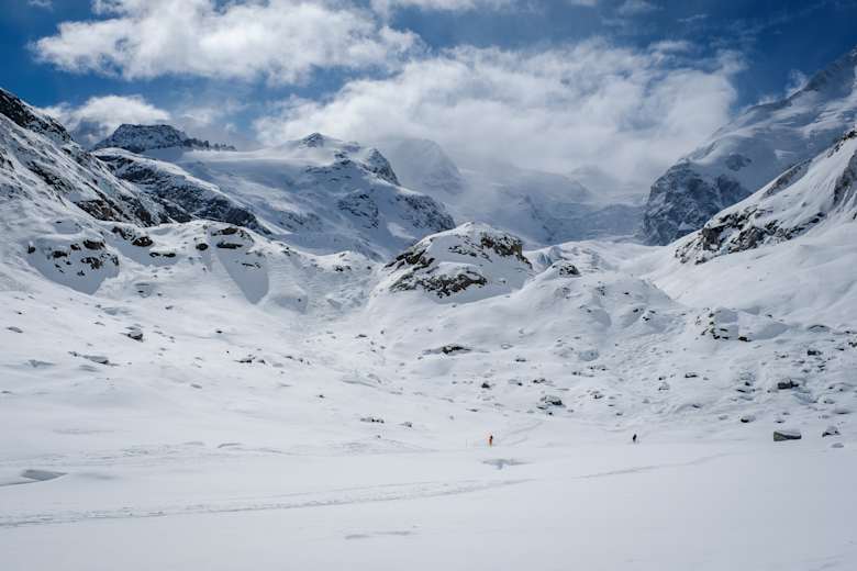 Die Abfahrt durch den spaltenreichen Gletscher verlangt höchste Konzentration. Nach dem untersten Gletscherbruch kann man dann aber die Ski laufen lassen. Schwingen in seiner schönsten Form ist angesagt. Am unteren Ende des Persgletschers mündet die Abfahrt in die Piste der Diavolezzabahn. Über den Morteratsch Gletscher und danach flach weiter erreicht man die Bahnstation Morteratsch (1.896 m). Die Rhätische Bahn bringt die erschöpften, aber glücklichen Skifahrer zurück zur Talstation der Diavolezza.