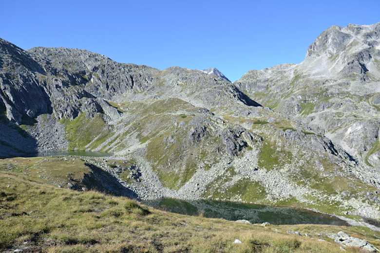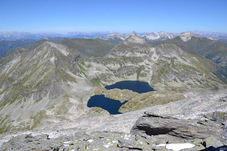 Dann erreicht man den höchsten Punkt der Tour, den Weinschnabel, 2.754 m. Ausreichend genießt man die herrliche Aussicht und stärkt sich für den Weiterweg, man hat jetzt ziemlich genau die Hälfte der Rundtour hinter sich. Der Abstieg zur Muritzenscharte und zum oberen Schwarzsee erfolgt zum Teil über große Steinplatten, ist aber nicht schwierig. Zwischen dem Oberen und Unteren Schwarzsee ist ein kurzes Stück mit einem Drahtseil und Stahlbügeln versichert, hier ist Trittsicherheit gefragt. Ein kurzes Steilstück führt anschließend auf die Schmalzscharte, 2.444 m. Hier genießt man von der kleinen, steinern Aussichtskanzel noch einmal das wunderbare Panorama der Hafnergruppe mit den tiefblauen Schwarzseen.