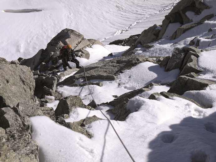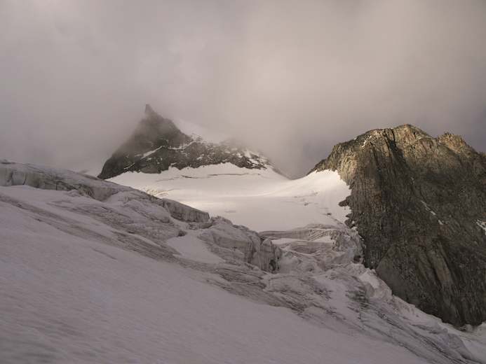 Ein sanfter Firngrat wie aus dem Bilderbuch. Von hier ist es nicht mehr weit zum Gipfel der Grande Lui. Foto: topoverlag - Daniel Silbernagel Während der Gipfel noch in den Wolken weilt, ist der kombinierte Abschnitt, die Schlüsselstelle, bereits sichtbar. Foto: topoverlag - Daniel Silbernagel Im kombinierten Felsteil Foto: topoverlag - Daniel Silbernagel Der Gipfel liegt zurück. Im Hintergrund die Grande Lui mit der Abstiegsroute. Foto: topoverlag - Daniel Silbernagel Bildergalerie (4)
