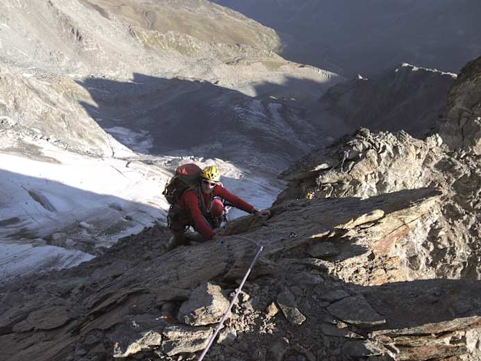 Der mächtige Schneedom des Mont Velan (3.726 m) an der Grenze von Aosta und Wallis ist vor allem als erstklassiger Skiberg bekannt. Seine Lage zwischen Mont Blanc und Grand Combin inmitten der Walliser Alpen bietet jedoch auch im Sommer tolles Berggelände und ein einmaliges Panorama. Ab dem beidseitig kettenversicherten Col de la Gouille folgt man dem einfachen, aber zum Teil brüchigen Felsgrat zum Gipfel. Der Arête de la Gouille vermittelt eine interessante Alternative zum praktisch reinen Gletscheranstieg der Normalroute. Dominanter Blickfang während des ganzen Anstiegs ist der wuchtige Grand Combin.