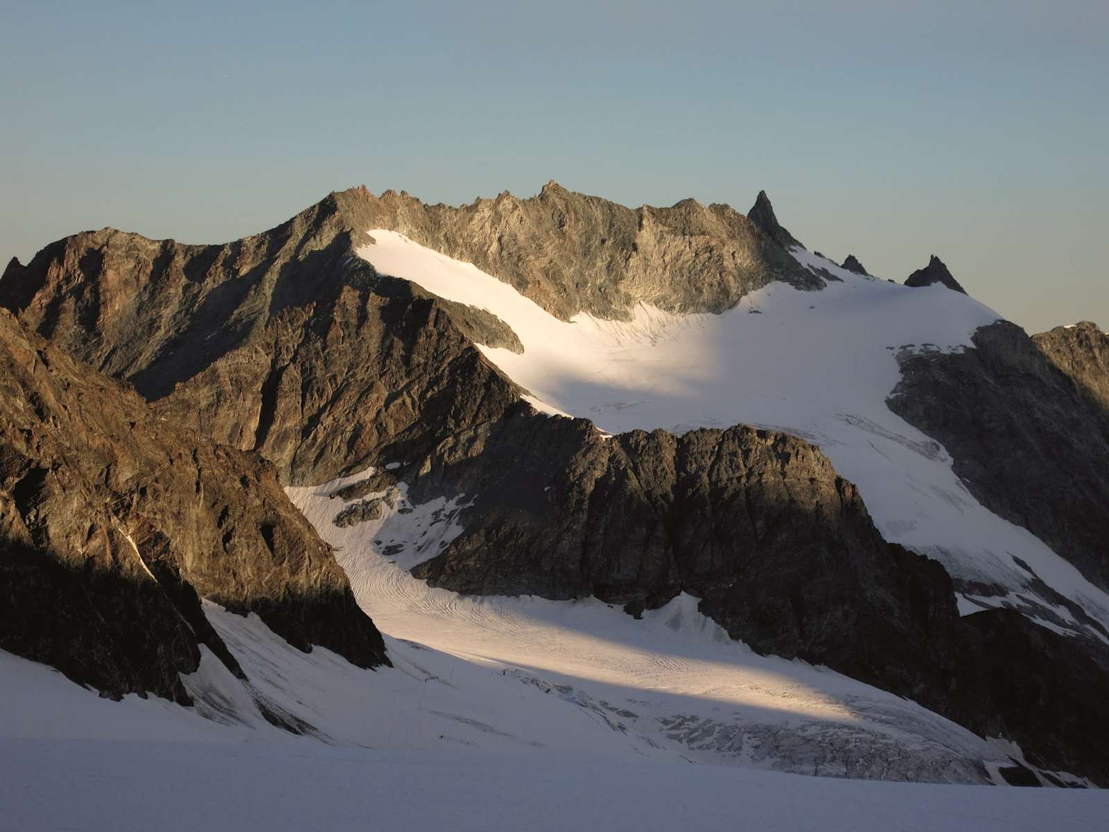 Das Morgenlicht erreicht die Aiguille de la Tsa noch nicht ganz. Foto: topoverlag - Daniel Silbernagel Der Zahn der Zeit. Blick im Aufstieg zur Cabane des Vignettes. Von dieser Seite locken einige, deutlich schwere Klettereien. Auf der Rückseite liegt die Normalroute. Foto: topoverlag - Daniel Silbernagel Bildergalerie (2)