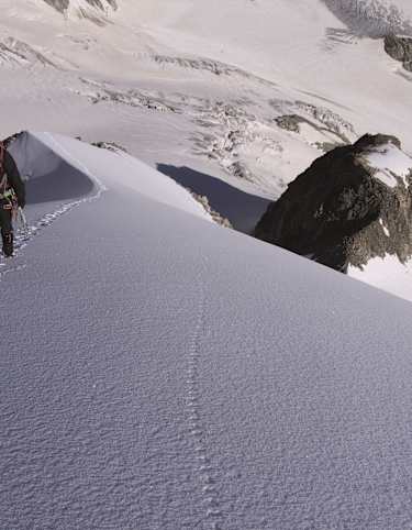 Von der Cabane de Bertol (3.311 m) auf den Gletscher absteigen und nordöstlich der Pointe de Bertol über einen Firn und Geröllhang auf das obere Gletscherplateau nahe dem Col de la Tsa.