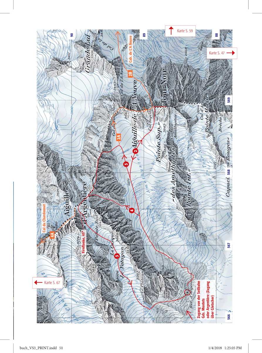 Auf den Aiguille d‘Argentière (3.901 m) führen über 30 Routen: Von der Schweizer Seite bieten die NE-Wand sowie das Couloir Barbey schöne Eis- und Firntouren. Die weiteren Anstiege werden eher selten besucht, darunter fällt auch der NW-Grat. Von der französischen Seite führt der Normalaufstieg über den Glacier du Milieu, der als leichteste Route auch für den Abstieg und als klassische Skitourenroute im Frühjahr zu empfehlen ist. Eine schöne Variante ist auch die Überschreitung Aiguille de l´A Neuve (Schwierigkeit: WS+/2, 2–3 ).