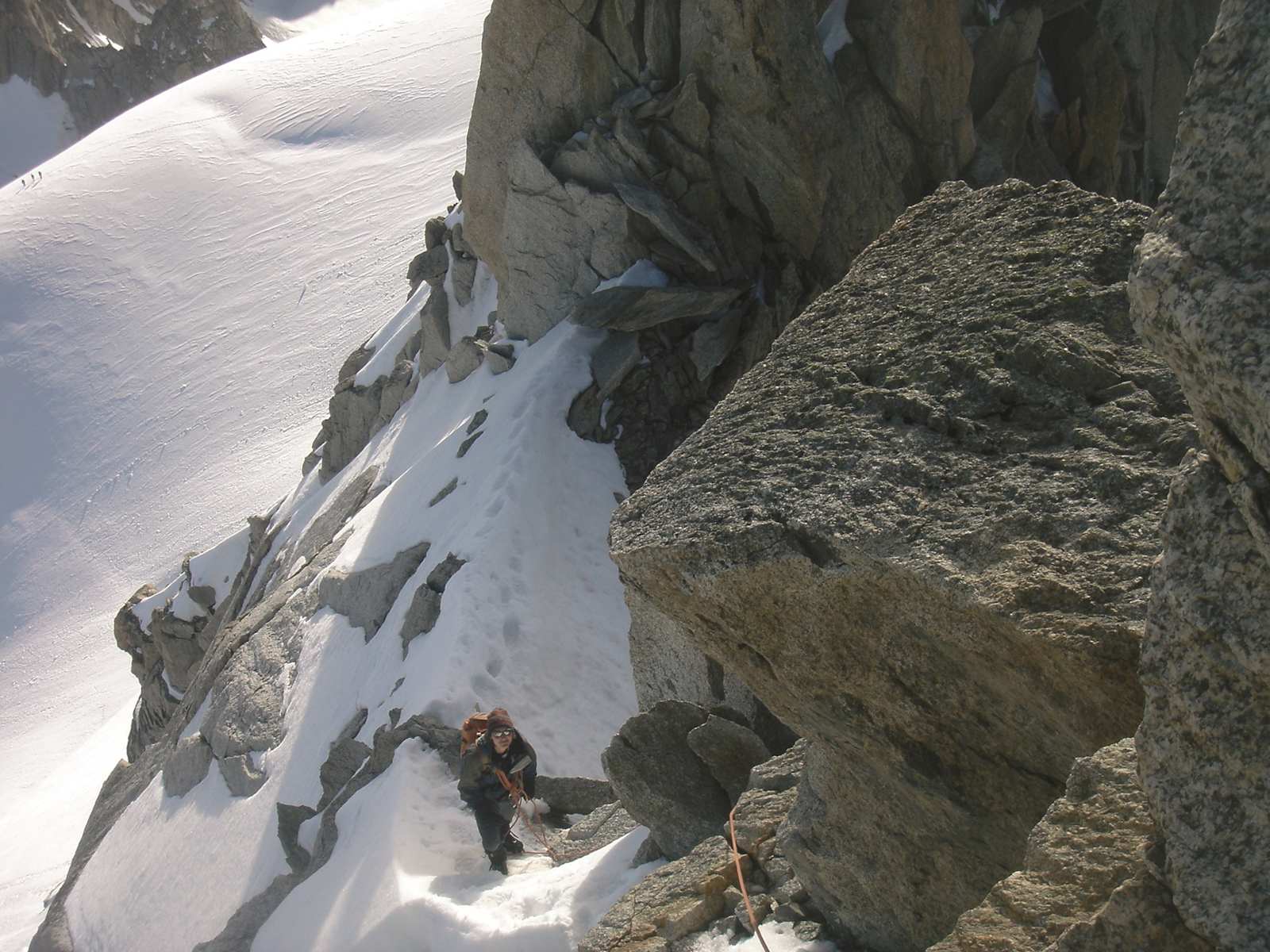 Neben einem steilen Eiswändchen kommen luftige Kletterstellen dazu, kurze Querungen im Eis, dann wieder fester Fels. Wie so oft verlangt auch die Aiguille du Chardonnet im Abstieg noch einiges. Abseilmanöver, steile Flanken und weite Bergschründe erinnern die Alpinisten mit einem breiten Grinsen daran.