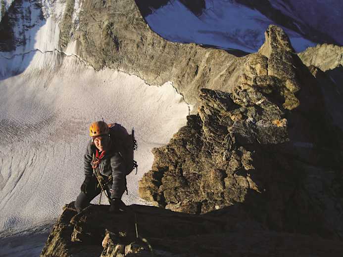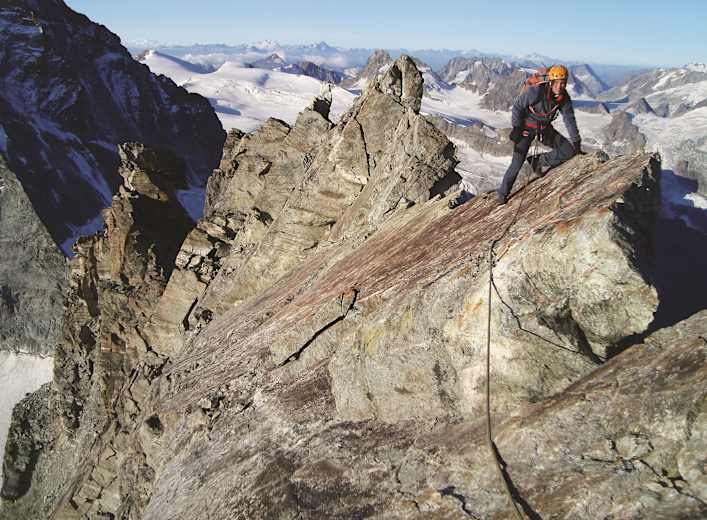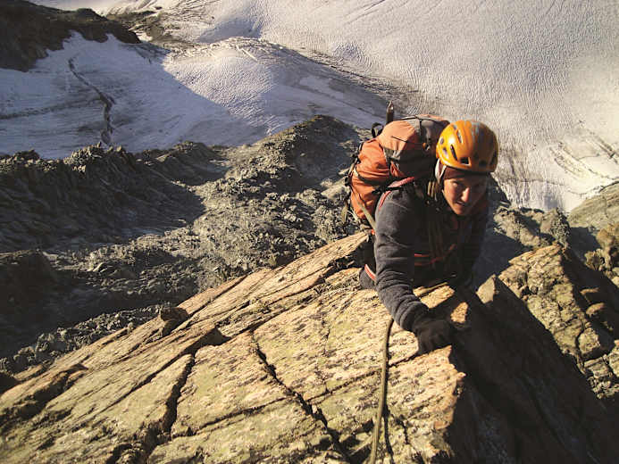 Der Anfang ist leicht, dann wird der Grat zunehmend schwieriger, bis zuletzt auf dem fast horizontalen letzten Gratabschnitt viele kleine Türme überklettert werden müssen – luftig! Im Abstieg über den NW-Grat auf die weite Gletscherfläche mit großen Spalten, verbergen sich noch einige Kletterstellen. Ein kurzer Eishang vom NW-Grat auf den Gletscher würzt zum Schluss.