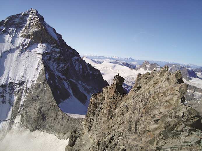 Blick vom Ferpèclegrat hinüber zum Grand Cornier. Foto: topoverlag - Daniel Silbernagel Hier beginnt der luftige Schlussgrat. Weit unten leuchtet das kleine Biwakdach. Foto: topoverlag - Daniel Silbernagel Kletterei an der ausgesetzten Ecke, unterhalb des blockigen Turms. Foto: topoverlag - Daniel Silbernagel Blick vom Gipfel des Grand Cornier über den am Schluss luftigen SW-Grat. Dahinter die mächtige Dent Blanche. Welch eine Kulisse! Foto: topoverlag - Daniel Silbernagel Blick vom Bivouac au Col de la Dent Blanche zum SW-Grat. Bis zu P. 3733 ist der Grat leicht. Danach folgen zunehmend schöne, am Schluss exponierte Kletterstellen. Foto: topoverlag - Daniel Silbernagel Bildergalerie (6)
