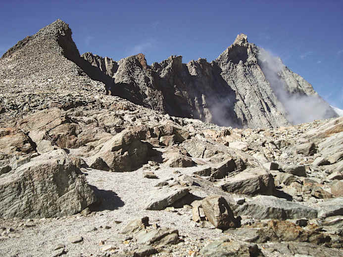 Dauer: Aufstieg 3-4 h, Abstieg 4 h. Schlüsselstelle: Kletterei auf blockartiger Turm und Schlussgrat.