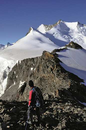 Im Abstieg vom Balfrin (P. 3795 Hauptgipfel). In der Ferne das Ulrichshorn. Foto: topoverlag - Daniel Silbernagel