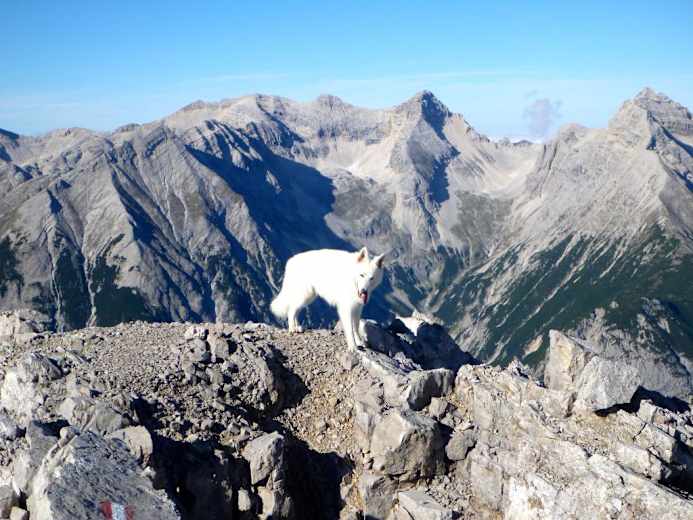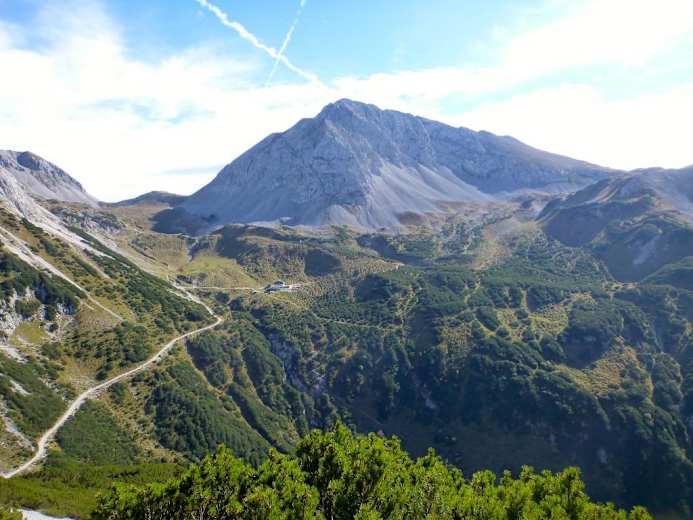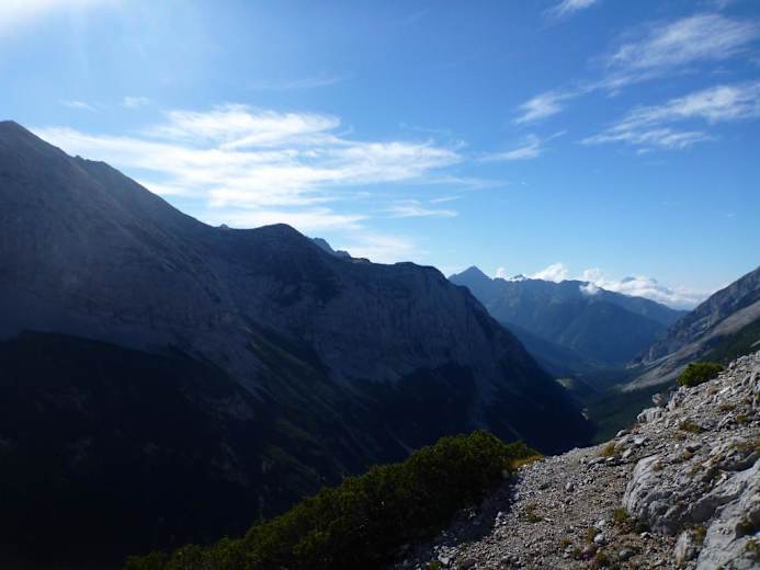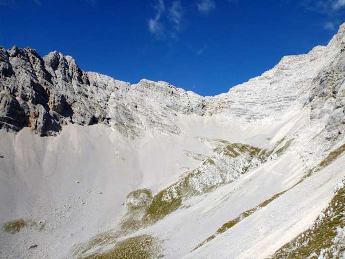 Hier hat man einen herrlichen Einblick in das Kaskar und den weiteren Wegeverlauf. Ab hier quert man eine Schotterreise und steuert direkt auf einen Grashügel zu. Immer Richtung Norden haltend wird es steiler und sehr grobschottrig, bis man auf den Felsbändern, die zum Gipfel führen, angelangt ist. Die letzten sehr steinreichen Höhenmenter haben es noch mal in sich, dafür genießt man dann beim kleinen Holzkreuz die Sicht über das Karwendel.