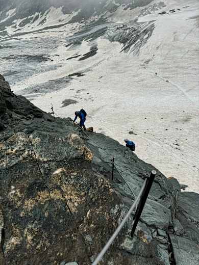 Der letzte Steilaufschwung (II+), wieder mit Eisenstangen und Bohrhaken gesichert, führt auf den Gipfel des Großglockners 3.798 m.