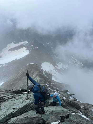 Die Tour auf den Großglockner ist auch über den „Normalweg“ ein ernst zu nehmendes Unterfangen. Wer mit der Sicherungstechnik und mit dem Gehen am Gletscher inkl. Steigeisen nicht zu 100 % vertraut ist, sollte sich einen Bergführer gönnen, der einen sicher auf den Gipfel und wieder zurück führt.