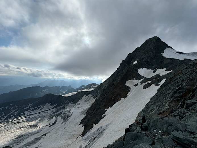Von der Erzherzog-Johnann-Hütte zuerst flach und dann steil hinauf bis zum jetzt ausgeaperten Glocknerleitl. Zuerst über Fixseile, dann teilweise mit Bohrhaken gesichert über dieses hinauf (Achtung Steinschlag) ins Sattele, dann über den Grat, hier finden sich Eisenstangen zum Sichern. Über den Kleinglockner, 3.370 m, flacher aber ausgesetzt zum Stahseil, das über einen kurzen Abstieg zur Glocknerscharte führt.