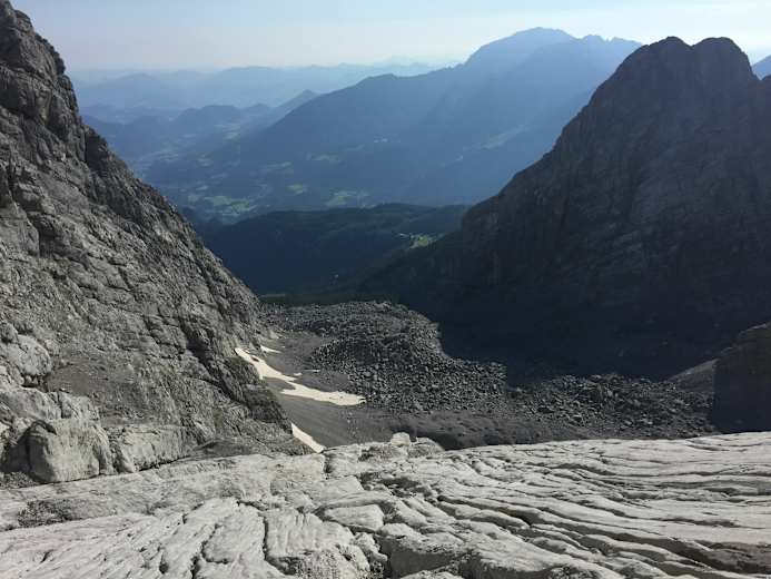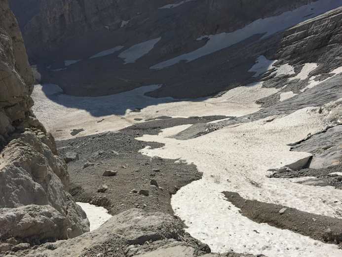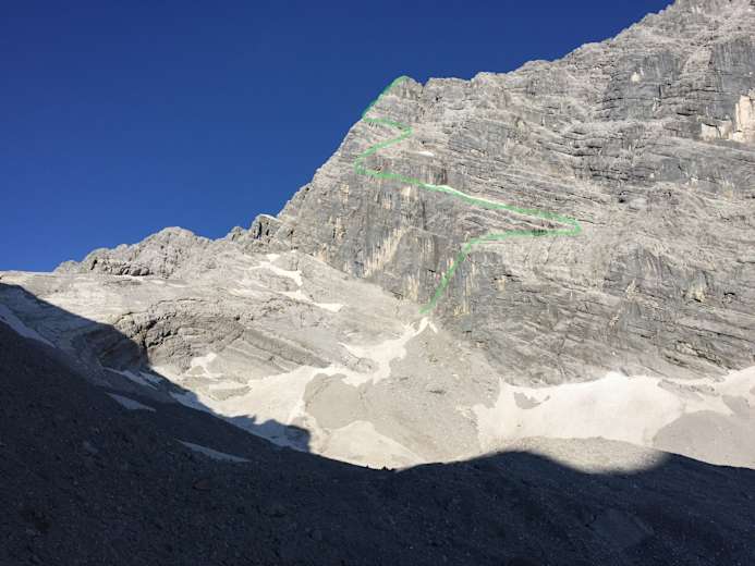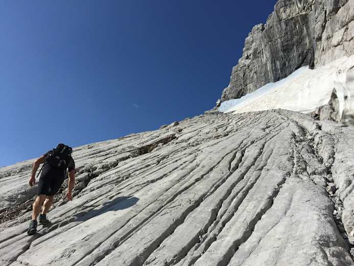 Im Kar angekommen werden die Steigspuren etwas schwacher. Den Wegspuren und den Steinmännern folgend steigt man hinauf in die Senke des Watzmanngletschers. Dort über Firn und/oder den Geröllhang rechts des Gletschers zum Wandfuß unterhalb des Wiederbandes aufsteigen.