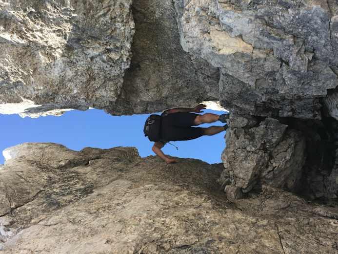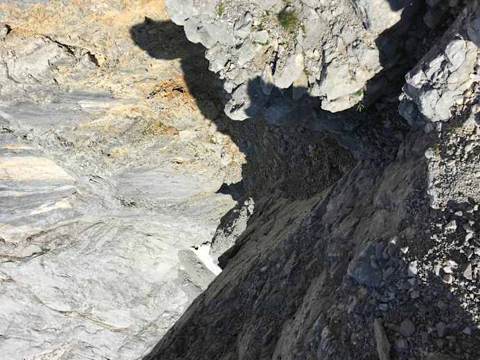 Gleich hinter dem Durchschlupf steigt man rechts eine steile Felsrinne (III-) empor. Ein roter Punkt markiert den Einstieg. Am Ende der Rinne befindet sich ein Felsenfenster. Hier dem schmalen Band nach rechts folgen.
