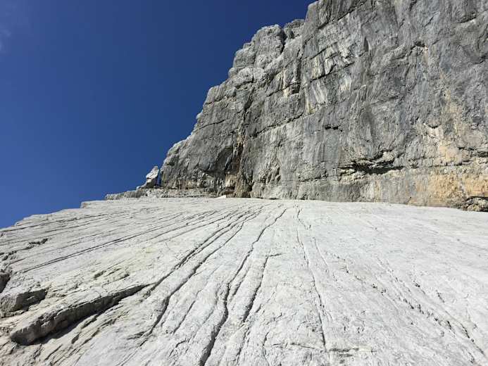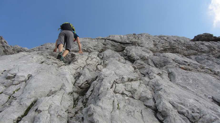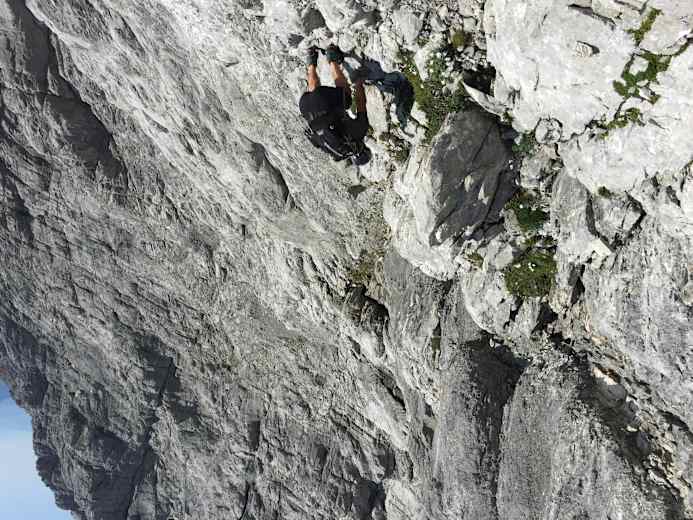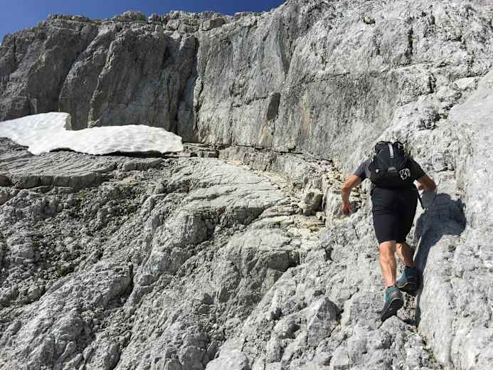 Das Band verengt sich jetzt zu einem schmalen, etwas exponierten Steg. Über eine Rinne und eine kurze Stufe klettert man weiter die Wand empor. Dann stets rechts halten und auf schmalen Bändern die Wand unterhalb des Mittelspitz Richtung Watzmanngrat traversieren.