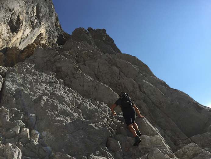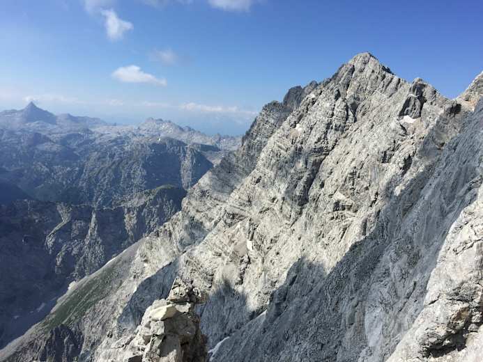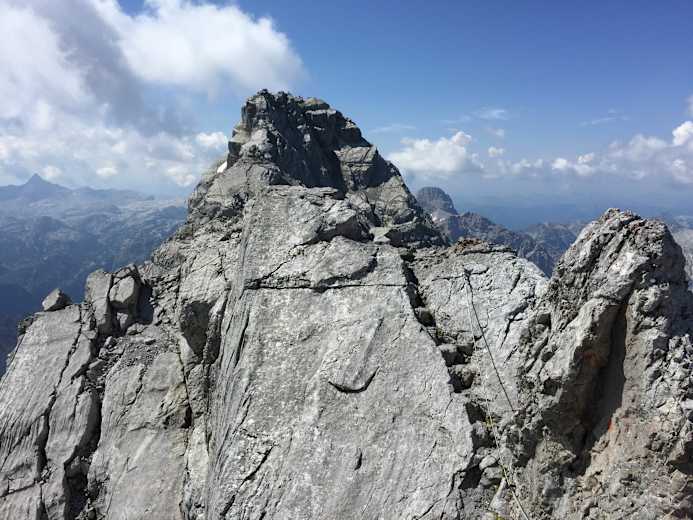 Nun gibt es zwei Möglichkeiten: die leichtere Variante (II+) führt über die Rinne zwischen Watzmanngrat und Gipfel zum Mittelspitz (2.713 m). Die schönere, aber etwas anspruchsvollere Alternative (III-) führt auf direkter Route in griffigen Fels zum Gipfel.