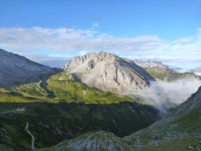 Ideale und kurze Nachmittagstour von der Pfeishütte aus oder auch als Gipfelziel für den Zustieg zur Hütte vom Hafelekar kommend. Von der Terrasse der Pfeishütte immer im Blickfeld nach Westen, ziehen zwei markanten Schotterrinnen vom südlichen und nördlichen Gipfel des Gleirschtaler Brandjochs im Tiroler Karwendel. Der Abschnitt ab der Mannlscharte zum Gipfel enthält leichte Kletterpassagen, die durch ein Stahlseil gesichert sind.