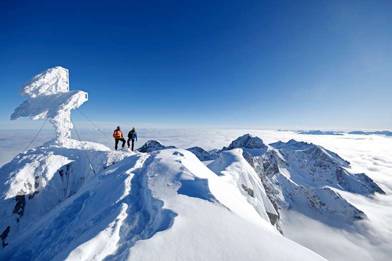 Vorsicht: Bei großem Andrang darf man die Gefahr durch Eis und Steinschlag nicht unterschätzen (Helm). Die Rinne ist zwar steil, aber gut durch Hacken, die immer wieder am Fels zu finden sind, abzusichern. Bald ist das Eiserne Kreuz am Gipfel erreicht und das großartige Panorama entschädigt für die Mühen des Aufstiegs. Zurück geht es wieder auf der bereits bekannten Route.