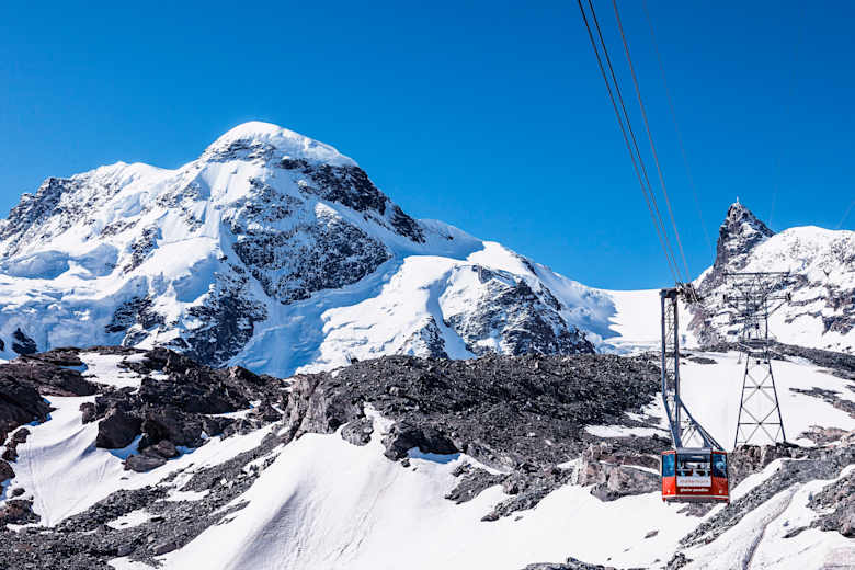Der erste Tag der 5-tägigen Tour durch die Monte Rosa dient der Akklimatisation - an die Höhe aber auch an die Geschwindigkeit in einer hochalpinen Landschaft. Zermatt, als eines der bekanntesten Bergdörfer der Alpen, bietet dabei vieles: Unterkunftsmöglichkeiten, Gastronomie, Bergschulen und alle Arten von Bergaktivitäten. Die Seilbahnen - ob über Stahlkabel in luftigen Höhen oder Schienen zu exponierten Orten - sind dabei der Schlüssel zu fast allen Aktivitäten um Zermatt.
