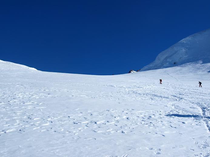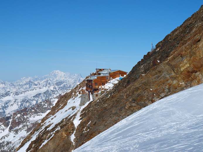 Zeitig beginnt man den Anstieg von der recht modernen Mantova Hütte zur Capanna Margherita auf, rund 1.100 Hm höher. Man passiert dabei nach kurzer Zeit das Rifugio Gnifetti (3.647 m), die rechts umgangen wird. Weiter geht es über das Plateau bis hin zum südwestlichen Rand der Vincentpyramide (4.215 m).
